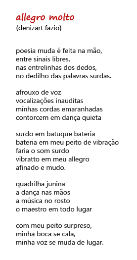 Denizart Fazio é um poeta contemporâneo, dos grandes. Seu verso é dança: lê-lo é passear entre imagens que se movimentam em coreografia livre, palavras que nos ecoam em todos os seus (en)cantos. Um dia, após uma tarde em festa junina de surdos, rodeado por sinais e mãos ocupadas em prosas, Denizart fez do encontro palavras: um bonito poema, em língua portuguesa, sobre as línguas gestuais.