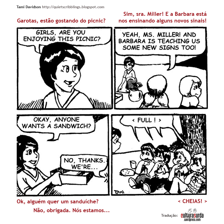 Os trabalhos da cartunista surda estadunidense Tamara (Tami) Davidson já foram publicados por uma série de organizações, sites e periódicos norte-americanos, como o jornal SIGNews. Alguns de seus “rabiscos” podem ser encontrados em seu blog Quiet Scribblings (“Rabiscos silenciosos”), onde partilha algumas de suas ilustrações.
