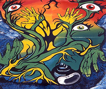 Na tela abaixo, Mertz retrata mãos e olhos, ressaltando a preponderância da experiência visual em seu cotidiano, deixando a cóclea (um dos órgãos responsáveis pela audição, indicada no quadrante inferior direito) em segundo plano.