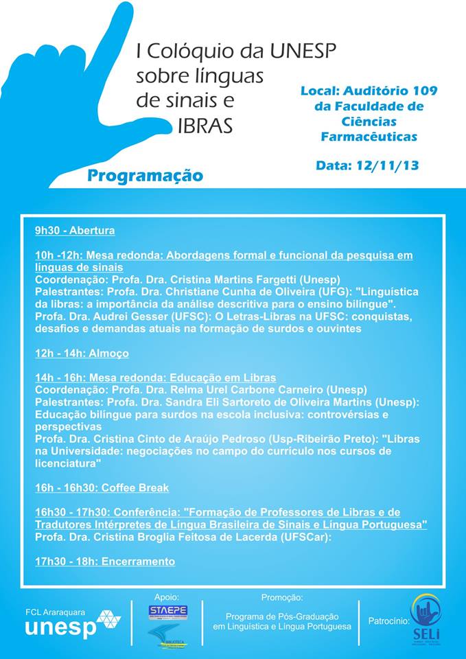 O I Colóquio da Unesp sobre Línguas de Sinais e Libras acontecerá no dia 12 de novembro de 2013, na Faculdade de Ciências Farmacêuticas do campus de Araraquara da Universidade Estadual Paulista Júlio de Mesquita Filho (Unesp). No evento, serão discutidos temas relacionados às línguas de sinais (como “Abordagens formal e funcional da pesquisa em língua de sinais” e “Educação em Libras”) em mesas e conferências abertas à estudantes, pesquisadores, professores, intérpretes e demais interessados pelo assunto. Clique aqui para mais informações.