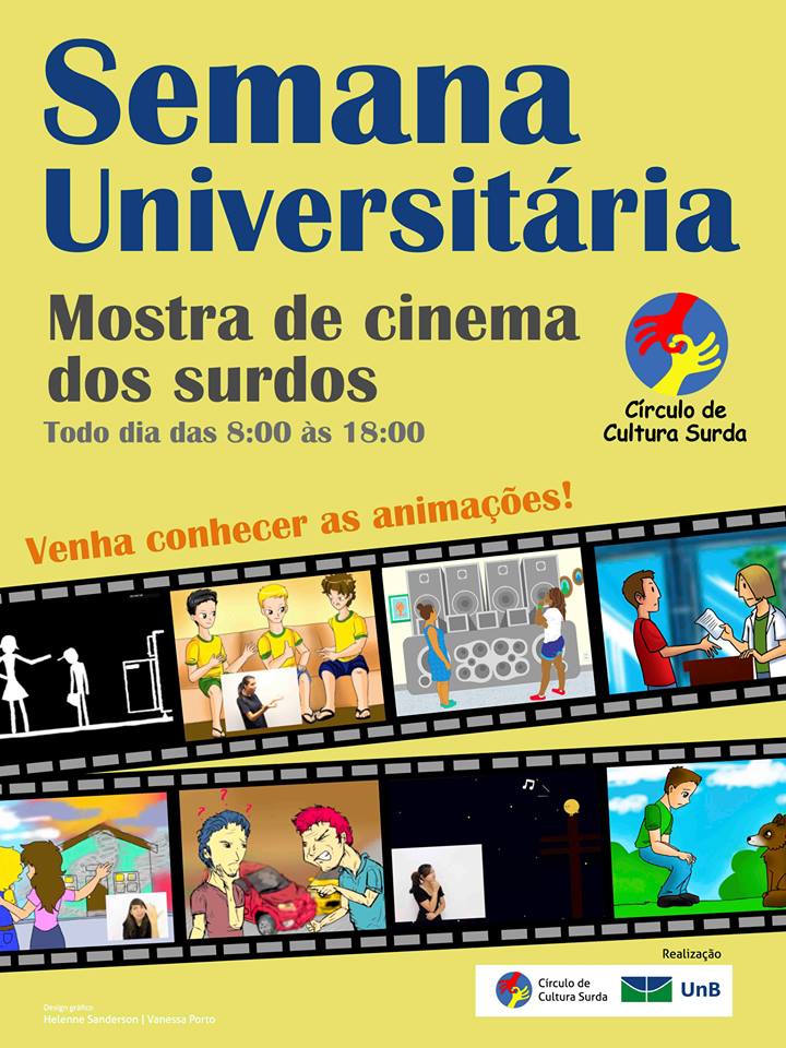 Dos dias 4 a 8 de novembro de 2013, durante a Semana Universitária da Universidade de Brasília (UnB), acontece a Mostra de Cinema dos Surdos, das 8h às 18h, no auditório da Psicologia no ICC Sul. Promovido pelo Círculo de Cultura Surda, os filmes – produzidos por surdos e ouvintes – retratam aspectos do dia-a-dia de surdos, bem como mostram características das comunidades e culturas surdas. (Para assistir a uma reportagem sobre as animações criadas pelo Círculo de Cultura Surda, clique aqui, para visualizar divulgação do evento, clique aqui).