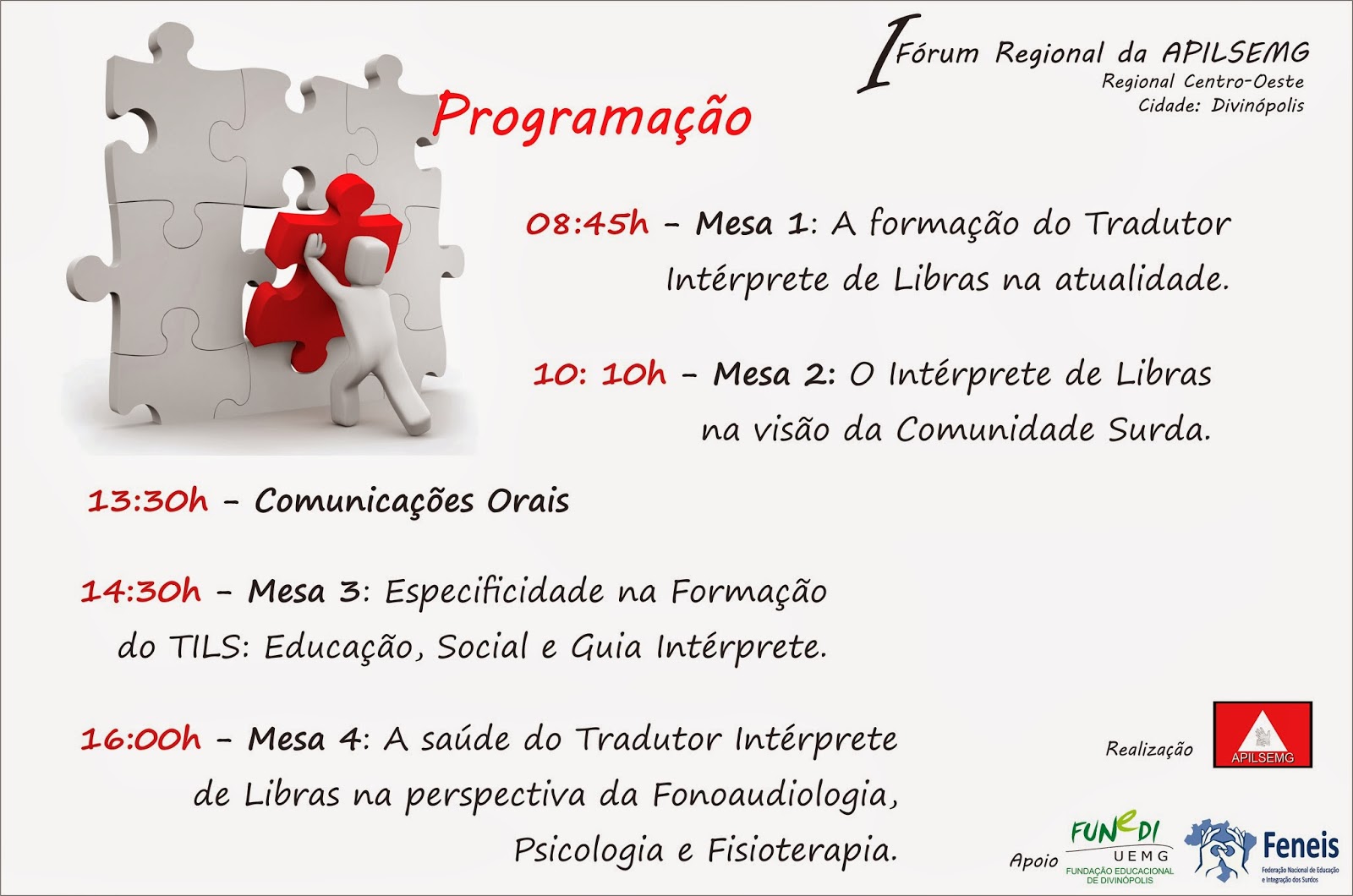 No próximo dia 09 de novembro, acontecerá na cidade de Divinópolis (MG) o I Fórum da APILSEMG (Associação dos Profissionais Intérpretes da Lingua de Sinais do Estado de Minas Gerais), com o tema “A formação do tradutor intérprete de Libras”. Além das comunicações orais, o evento contará com quatro mesas: “A formação do tradutor intérprete de Libras na atualidade”, “O intérprete de Libras na visão da comunidade surda”, “Especificidade na formação do TILS: Educação, Social e Guia Intéprete” e “A saúde do tradutor intérprete de Libras na perspectiva da Fonoaudiologia, Psicologia e Fisioterapia”. Para consultar a programação do evento, clique aqui. Para saber mais informações, acesse o site da APILSEMG, clique aqui.