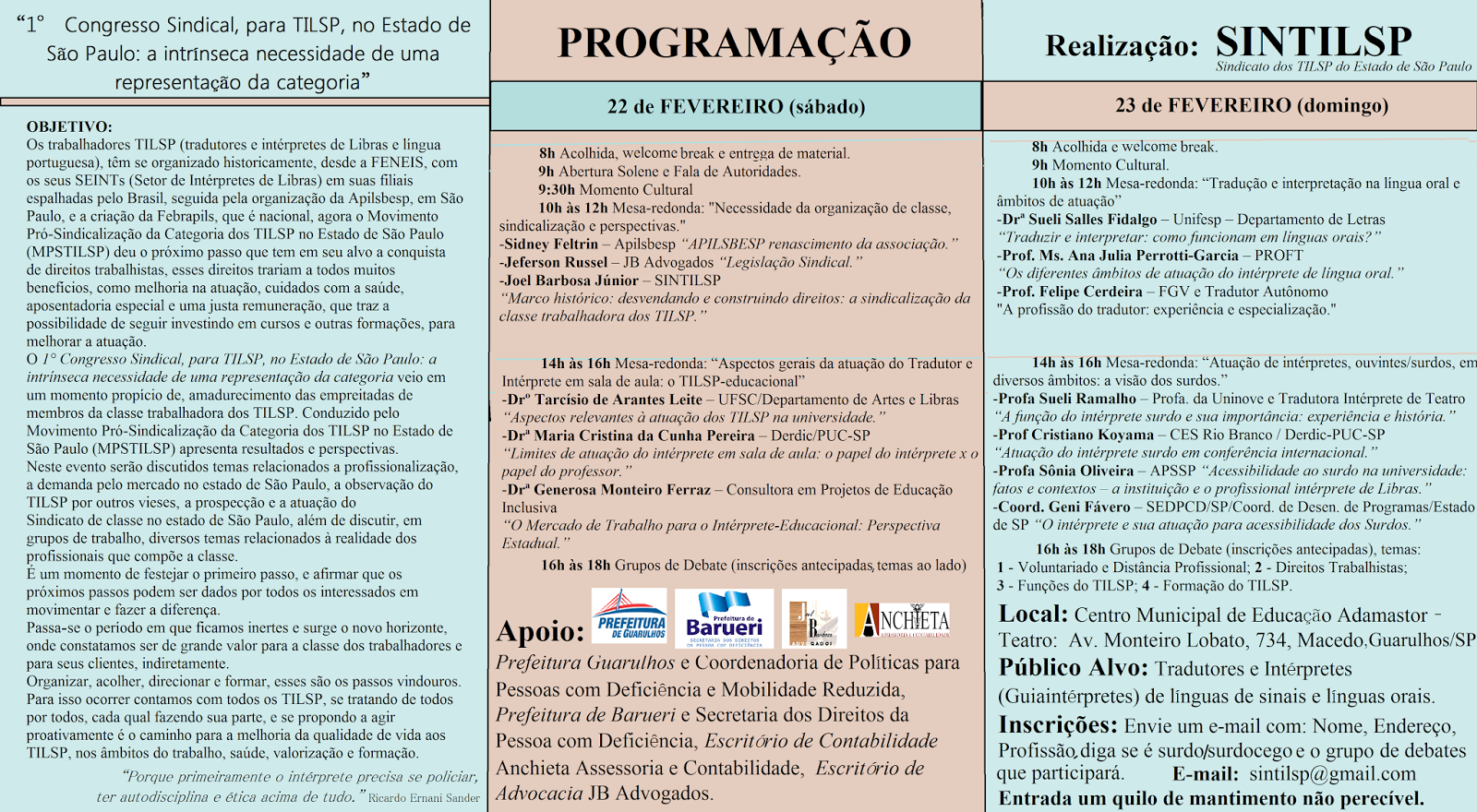 Nos dias 22 e 23 de fevereiro de 2014, acontecerá em Guarulhos o “I Congresso Sindical para TILSP” (TILS, uma sigla corrente nas comunidades surdas brasileiras, refere-se aos tradutores e intérpretes de língua de sinais). “Neste evento, serão discutidos temas relacionados à profissionalização, à demanda pelo mercado no estado de São Paulo, à observação do TILSP por outros vieses, à prospecção e à atuação do Sindicato de classe no estado de São Paulo, além de discutir, em grupos de trabalho, diversos temas relacionados à realidade dos profissionais que compõem a classe” (retirado da divulgação oficial). Para participar, é necessário doar um quilo de alimento não perecível. Para saber mais informações, como inscrições, local, programação, etc., clique aqui.