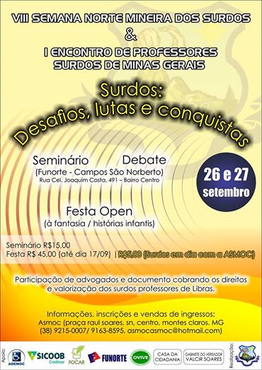 Nos dias 26 e 27 de setembro de 2014, será realizada em Montes Claros (Minas Gerais) a VIII Semana Norte Mineira dos Surdos e o I Encontro de Professores Surdos de Minas Gerais. Com o tema “Surdos: desafios, lutas e conquistas”, o evento contará com palestras e debates, além de – para quem interessar – uma festa comemorativa (à fantasia). Ao fim do seminário, será redigido um documento, pautado nas diretrizes estipuladas (porém, comumente não cumpridas) do decreto nº 5626/05, para se exigir os direitos dos professores surdos. Para mais informações, confira a divulgação do evento, clique aqui.