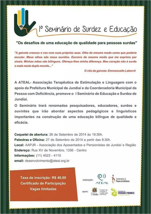 Neste sábado, 27 de setembro de 2014, será realizado em Jundiaí o I Seminário de Surdez e Educação. Promovido pela ATEAL (Associação Terapêutica de Estimulação e Linguagem), com o apoio da Prefeitura Municipal de Jundiaí e da Coordenadoria Municipal da Pessoa com Deficiência, o encontro “trará renomado pesquisadores, educadores, surdos e ouvintes que irão abordar aspectos pedagógicos e linguísticos importantes na construção de uma educação bilíngue de qualidade e eficácia” (retirado da divulgação oficial do evento). Para mais informações (inscrições, local, etc.), clique aqui.