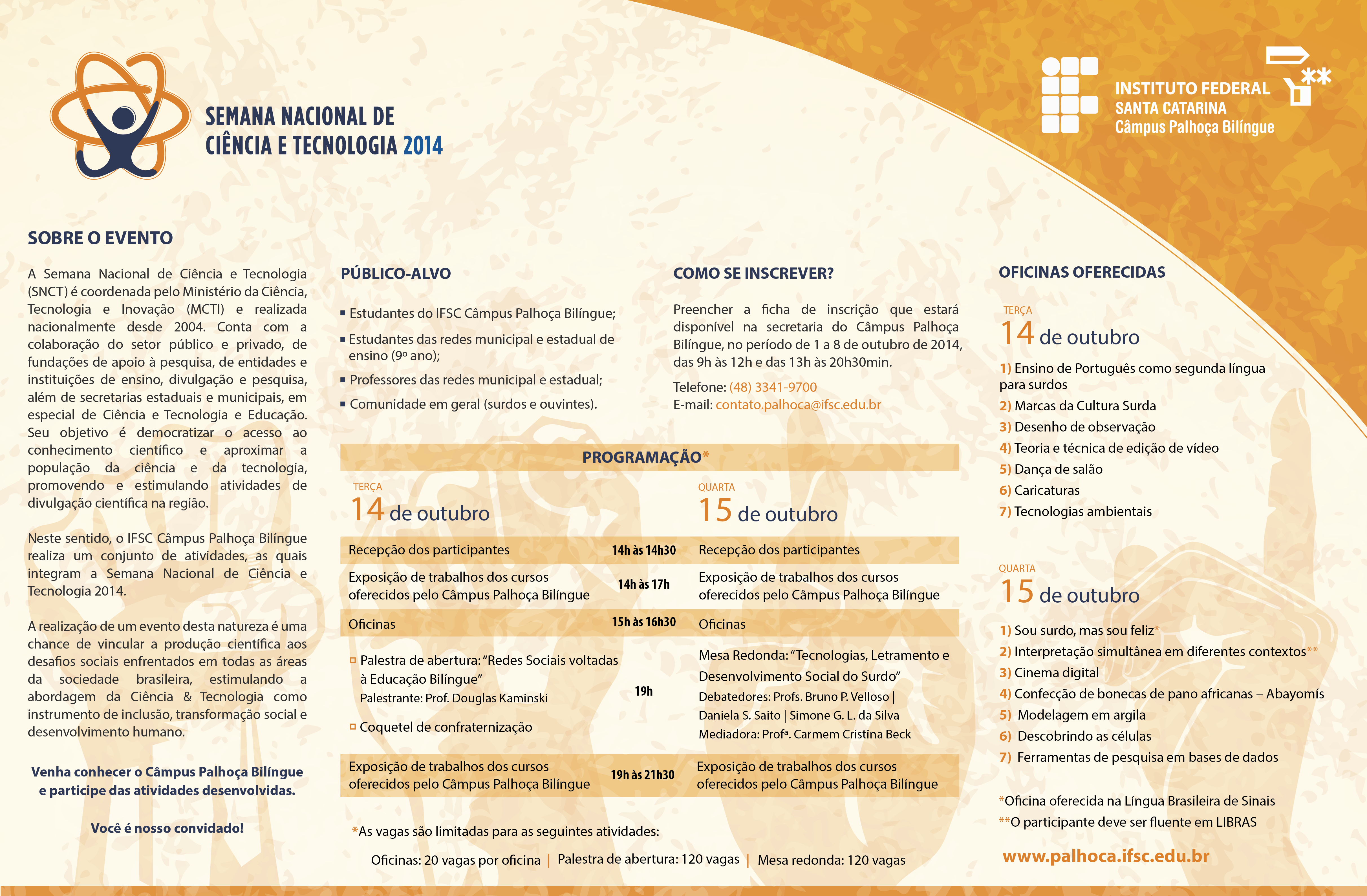 Nos dias 14 e 15 de outubro de 2014, o Campus Palhoça Bilíngue do Instituto Federal de Santa Catarina (IFSC) vai realizar a Semana Nacional de Ciência e Tecnologia 2014. “Seu objetivo é democratizar o acesso ao conhecimento científico e aproximar a população da ciência e da tecnologia, promovendo e estimulando atividades de divulgação científica na região” (retirado da divulgação oficial do evento). A instituição, a primeira unidade da Rede Federal de Educação Profissional e Tecnológica na modalidade bilíngue (Libras/Português), oferece uma série de cursos pautados pelos imperativos da surdez e, nesse evento, promoverá palestras, exposições de trabalhos, mesas redondas e oficinais atravessadas pelo tema. Para saber a programação e mais informações, clique aqui.