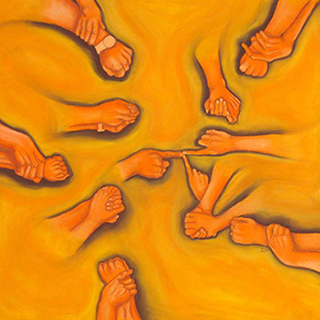 Muitas de suas obras, também, fazem referência à surdez, sobretudo às línguas de sinais, como na pintura abaixo, “Eu te amo em ASL”.