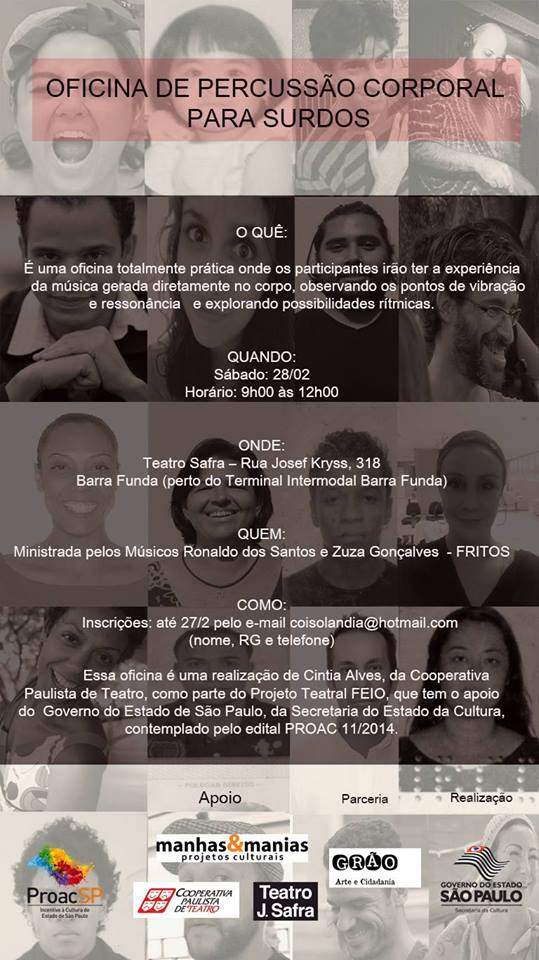 A Oficina de Percussão Corporal para Surdos é “uma oficina totalmente prática onde os participantes irão ter a experiência da música gerada diretamente no corpo, observando os pontos de vibração e ressonância e explorando possibilidades rítmicas”. Ministrado pelos músicos Ronaldo dos Santos e Zuza Gonçalves, o workshop será realizado no próximo sábado, 28 de fevereiro, das 9h às 12h, no Teatro Safra (Rua Josef Kryss, 318, Barra Funda, São Paulo). As inscrições devem ser feitas até 27/02 pelo e-mail coisolandia@hotmail.com. Para visualizar divulgação oficial, clique aqui; para assistir à divulgação em Libras, clique aqui.