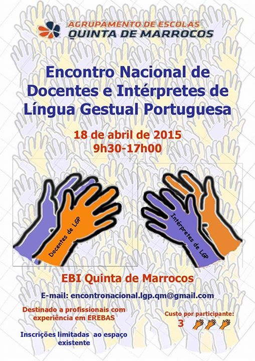 O Agrupamento de Escolas Quinta de Marrocos (Lisboa) promoverá, no próximo dia 18 de abril (das 9h30 às 17h), o Encontro Nacional de Docentes e Intérpretes de Língua Gestual Portuguesa. Destinado a profissionais com experiência em EREBAS (Escolas de Referência para a Educação Bilíngue de Alunos Surdos), o evento será realizado na EBI Quinta de Marrocos, com inscrições limitadas ao espaço existente. Para saber mais informações e efetuar inscrição, envie e-mail para encontronacional.lgp.qm@gmail.com (para visualizar divulgação oficial, clique aqui ).