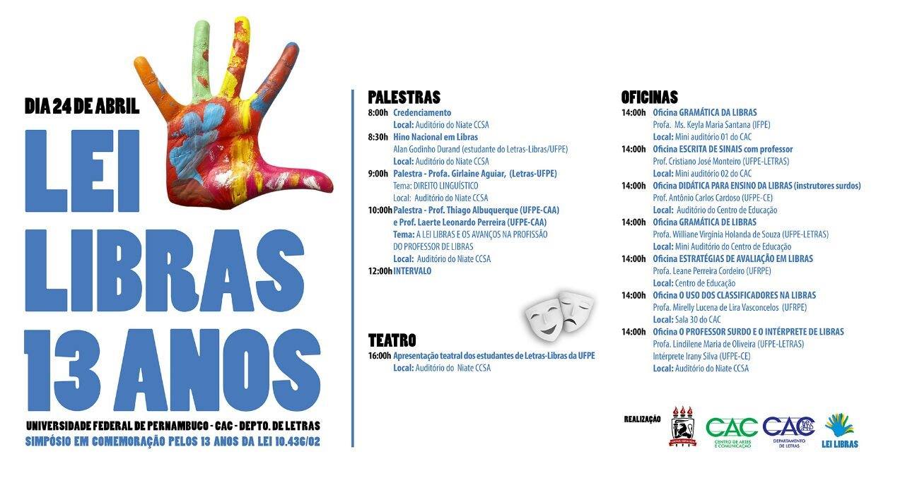 No próximo dia 24 de abril, a Universidade Federal de Pernambuco (UFPE) sediará um Simpósio em Comemoração pelos 13 anos da Lei 10.432/02, com palestras, debates e oficinas sobre diversos temas, como gramática da Libras, escrita de sinais, uso de classificadores, etc. Uma apresentação teatral organizada por estudantes de Letras-Libras completará o simpósio que, como outros tantos eventos realizados no mesmo dia Brasil afora, chamará a atenção para a importância e a riqueza da Língua de Sinais Brasileira. Para consultar locais e programação, clique aqui.