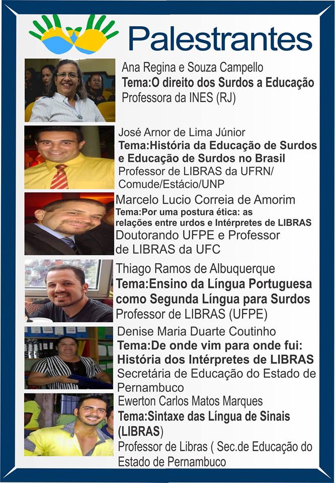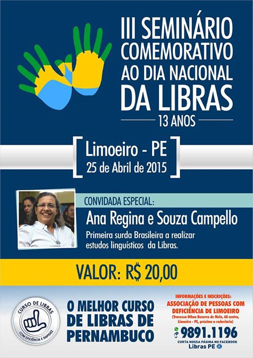 A cidade de Limoeiro (no Agreste pernambucano) também terá um evento em comemoração ao próximo Dia Nacional da Libras. Promovido pelo Curso de Libras com Eficiência e Rapidez, o III Seminário Comemorativo ao Dia Nacional da Libras será realizado no dia 25 de abril (sábado), das 8h às 16h30, na Faculdade de Ciências Aplicadas de Limoeiro (FACAL) e contará com diversas palestras sobre Libras, tradução e interpretação e educação de surdos (entre elas, as ministradas por Ana Regina Campello, Marcelo Lucio Correia de Amorim, José Arnor de Lima Júnior, entre outras). Confira aqui a programação do evento, e aqui a divulgação oficial.