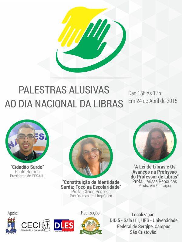 Amanhã, dia 24 de abril, surdos e ouvintes de Sergipe interessados em questões relacionadas às culturas surdas e às línguas de sinais poderão participar das Palestras Alusivas ao Dia Nacional da Libras. Promovido pelo Centro de Surdos de Aracaju (Cesaju), o evento será realizado na Universidade Federal de Sergipe (Campus São Cristóvão) e contará com palestras sobre o “Cidadão Surdo”, a “Constituição da Identidade Surda: foco na escolaridade” e “A lei de Libras e os avanços na profissão de professor de Libras”. Clique aqui para assistir à divulgação em Libras e aqui para visualizar divulgação oficial.