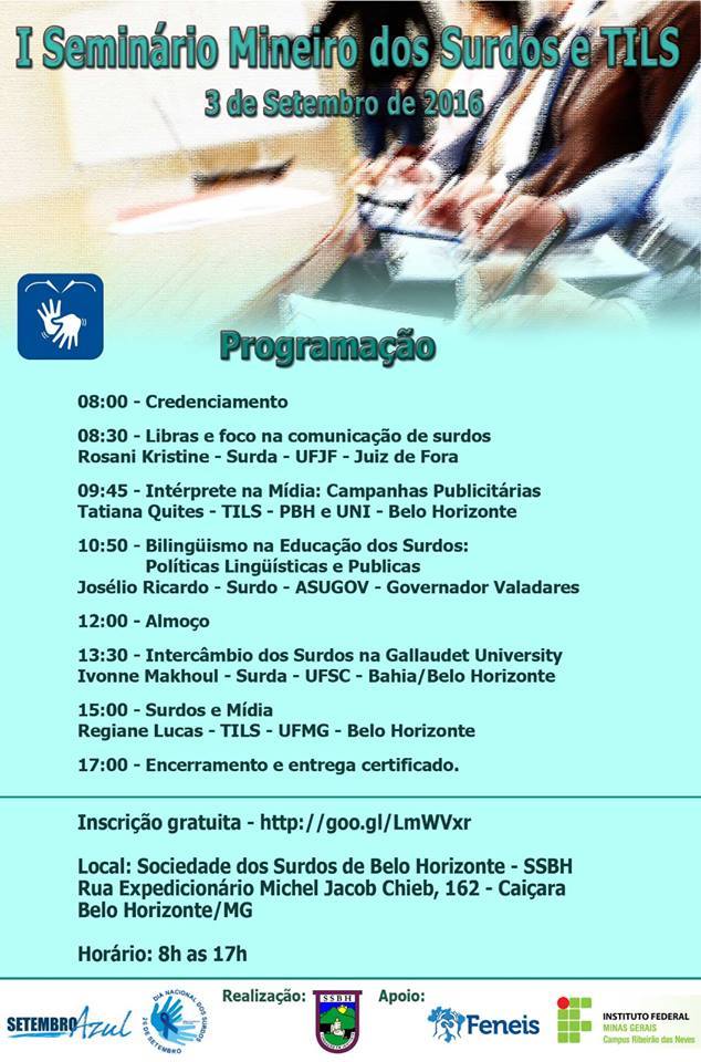 O I Seminário Mineiro dos Surdos e TILS será realizado no dia 03 de setembro, das 8h às 17h, na Sociedade dos Surdos de Belo Horizonte (SSBH). O evento, aberto para o público em geral, abordará temas relacionados à educação bilíngue para surdos, mídia, tradução e interpretação em campanhas publicitárias, etc. Para saber mais informações, visualize a divulgação oficial do evento, clique aqui.