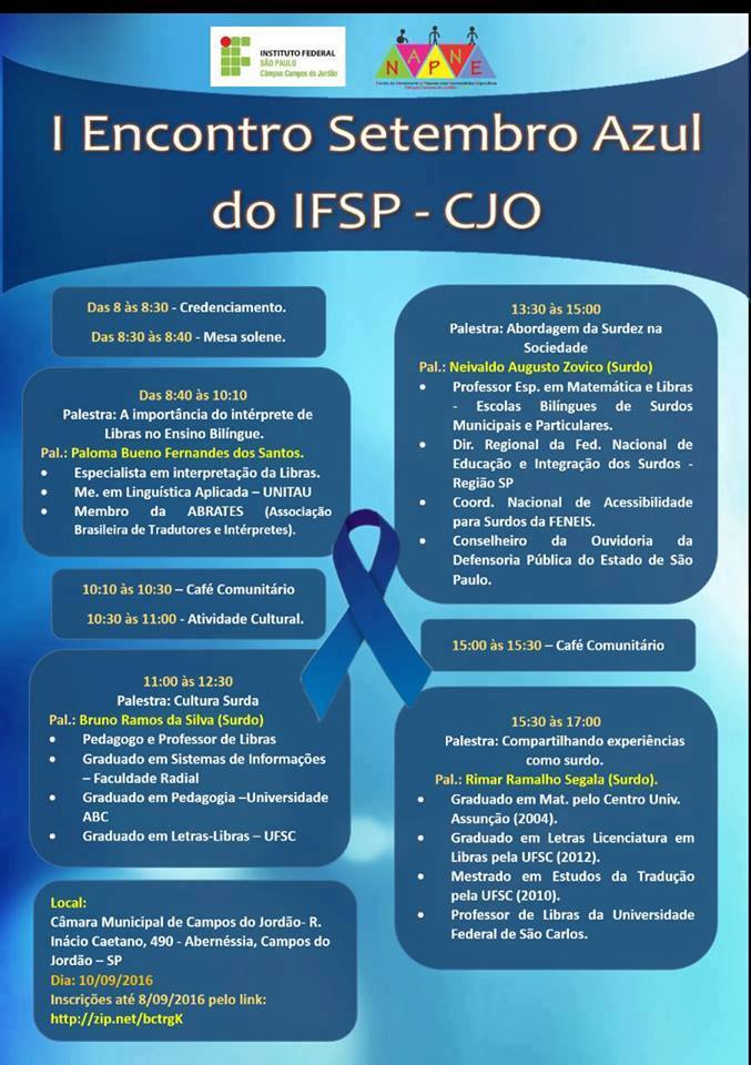 No dia 10 de setembro, acontecerá o I Encontro Setembro Azul do Instituo Federal de São Paulo – campus Campos do Jordão. No evento, temas como “a importância do intérprete de Libras no Ensino Bilíngue”, “Cultura Surda”, “abordagem da surdez na sociedade” e “compartilhando experiências como surdo” serão abordados em palestras e atividades culturais. O encontro será realizado das 8h às 17h na Câmara Municipal da cidade – para saber mais informações, visualize a divulgação oficial, clique aqui.
