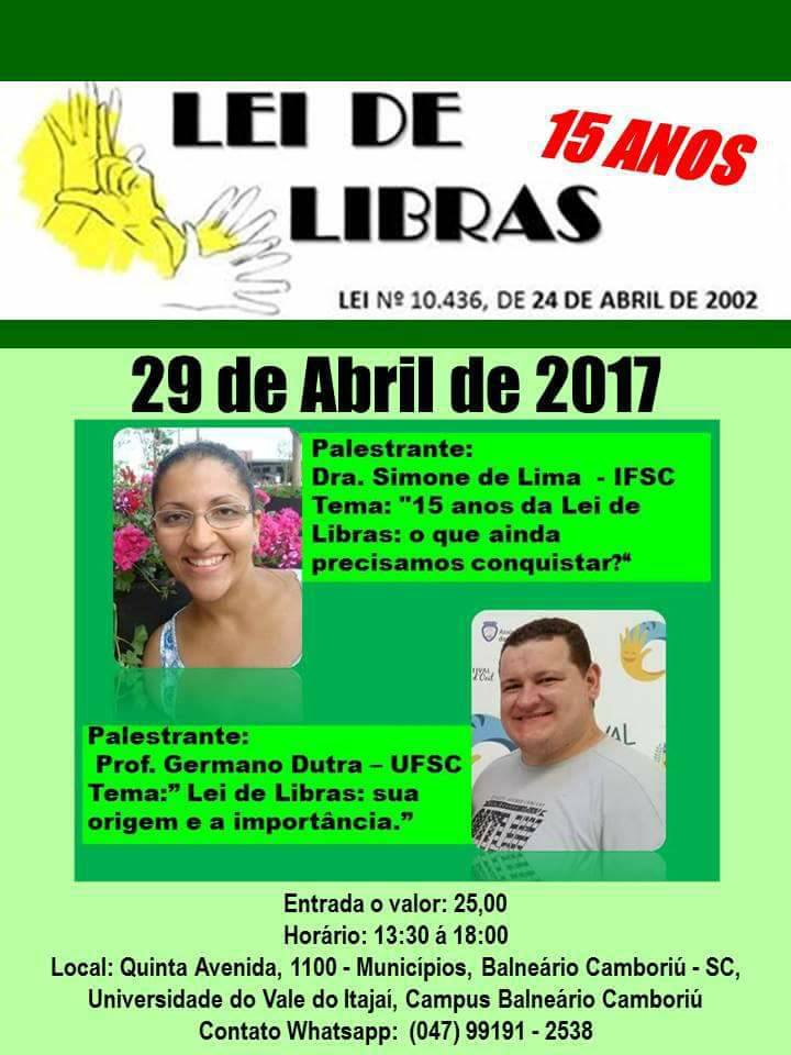 No próximo sábado, dia 29 de abril, das 13h30 às 18h00, vai acontecer em Balneário Camboriú (Santa Catarina) o evento “Lei de Libras – 15 anos”. O encontro contará com duas palestras sobre a Lei de Libras (lei nº 10.436/02): uma proferida pela Dra. Simone de Lima (IFSC), outra pelo professor Germano Dutra (UFSC). Para saber mais informações, confira aqui a divulgação oficial do evento. Para fazer inscrição, clique aqui.